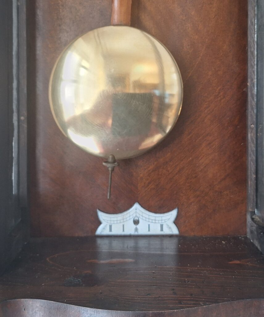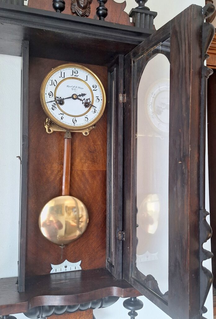 Powierzchnia skrzyni zegara zachowana orginalnie, Wyczyszczona i nawoskowana.