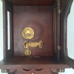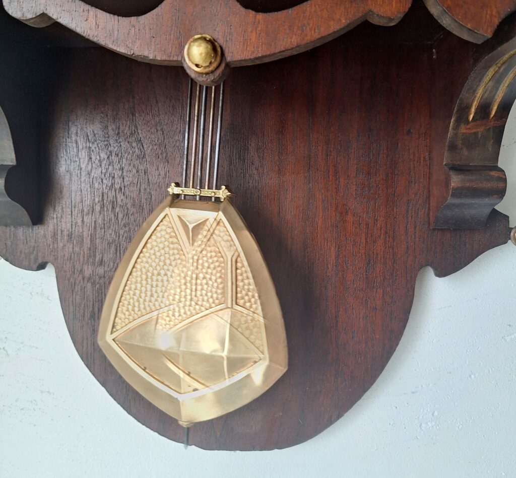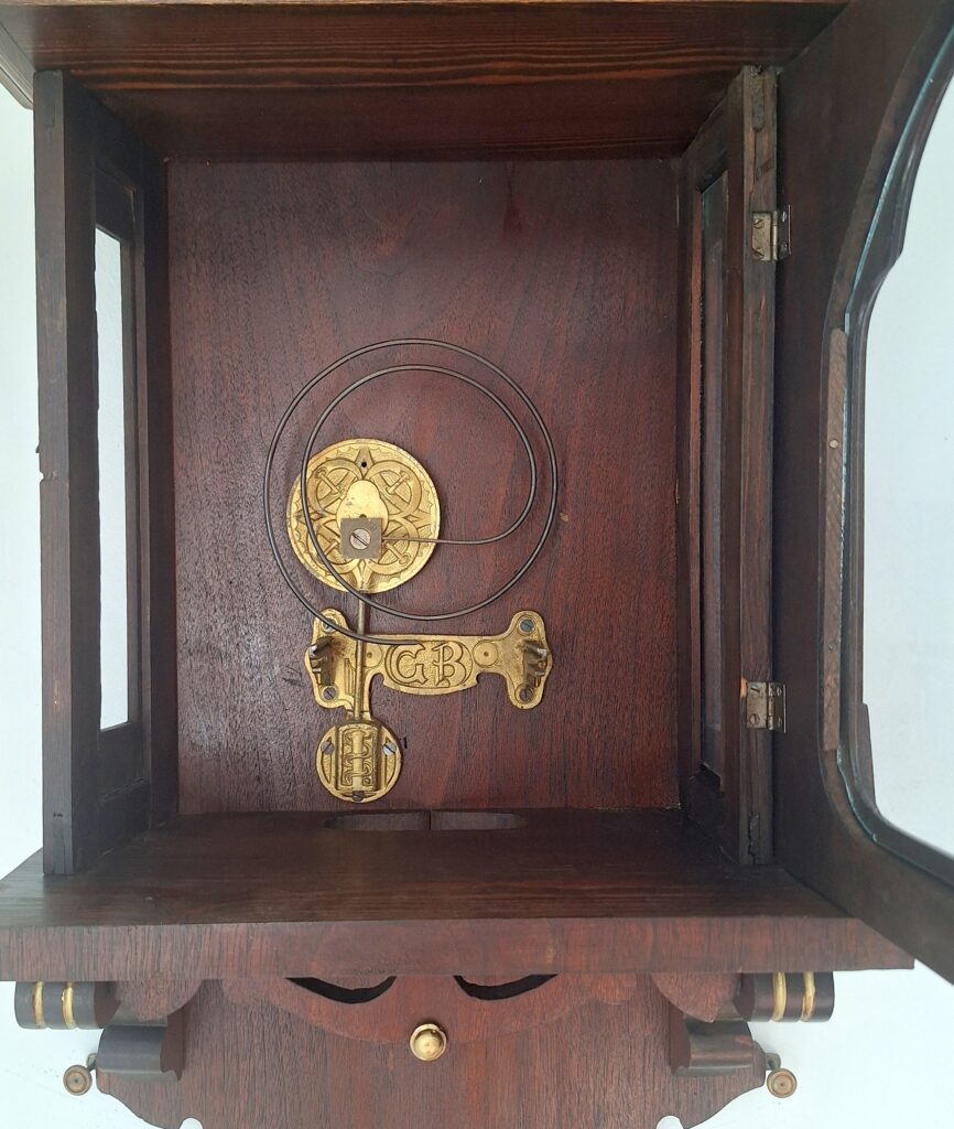 Tarcza (cyferblat współczesna kopia) i wahadło zachowane oryginalnie.