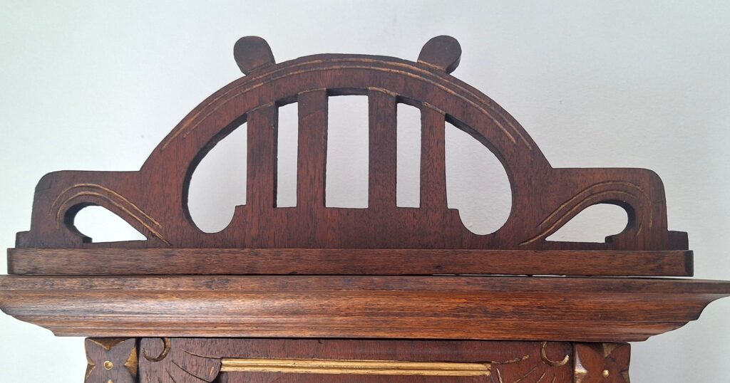 Powierzchnia skrzyni zegara odnowiona (bejca, wosk, politura).